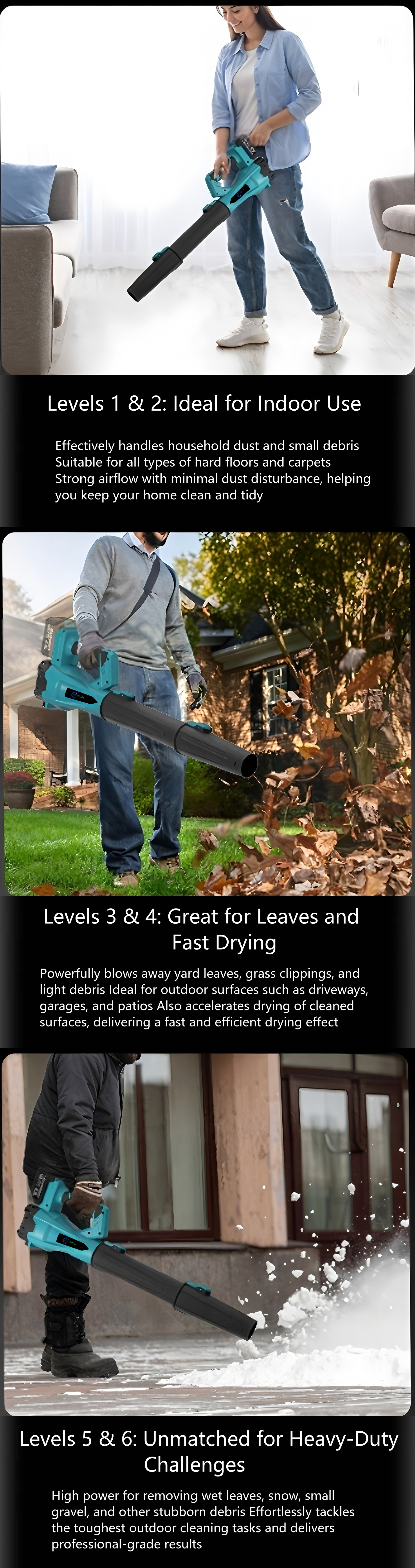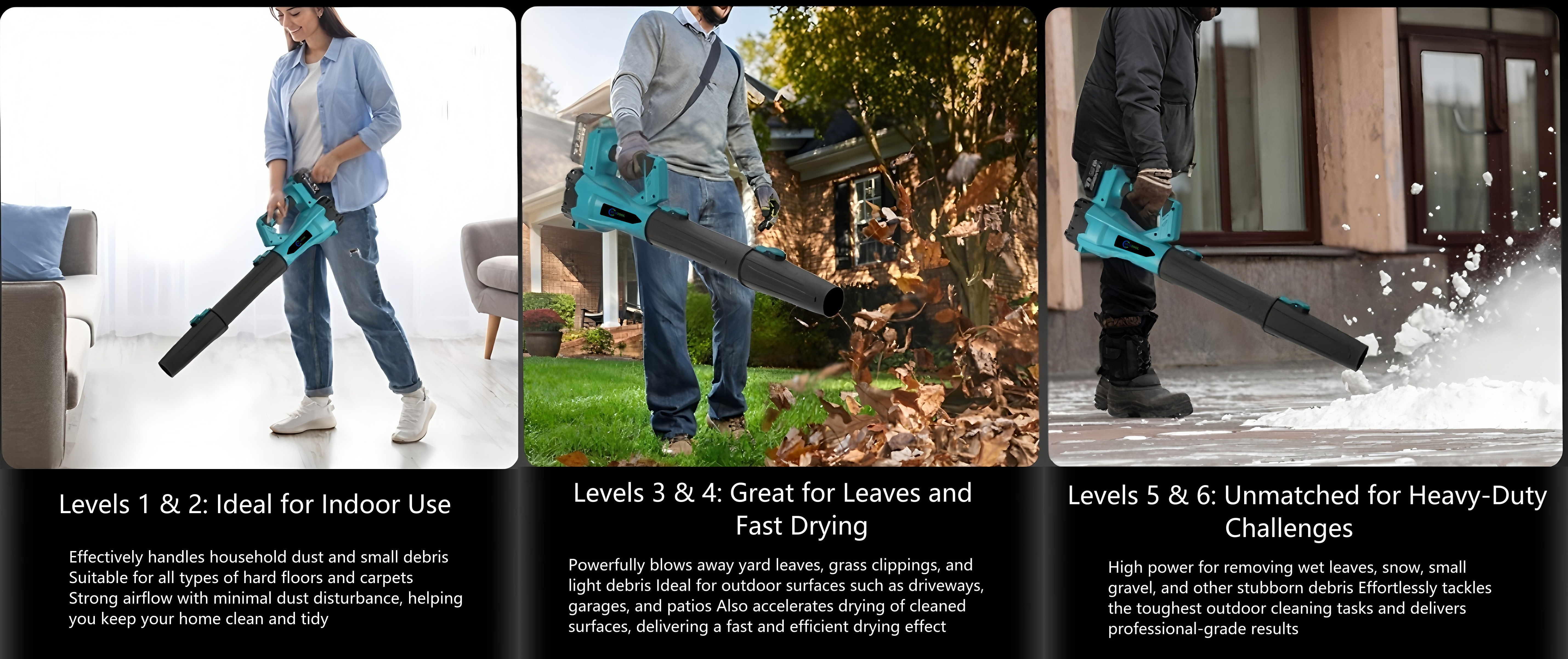 Level 3-4: Powerful cleaning of garden leaves and quick bursts for surface drying.