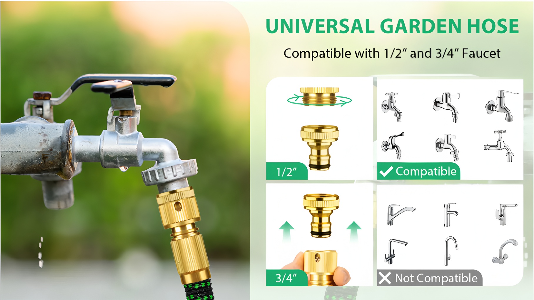 This hose is compatible with standard 1/2" and 3/4" outdoor taps only. It is not suitable for indoor mixer taps or non-threaded faucets. Please confirm your tap type before purchase to ensure a proper fit.
