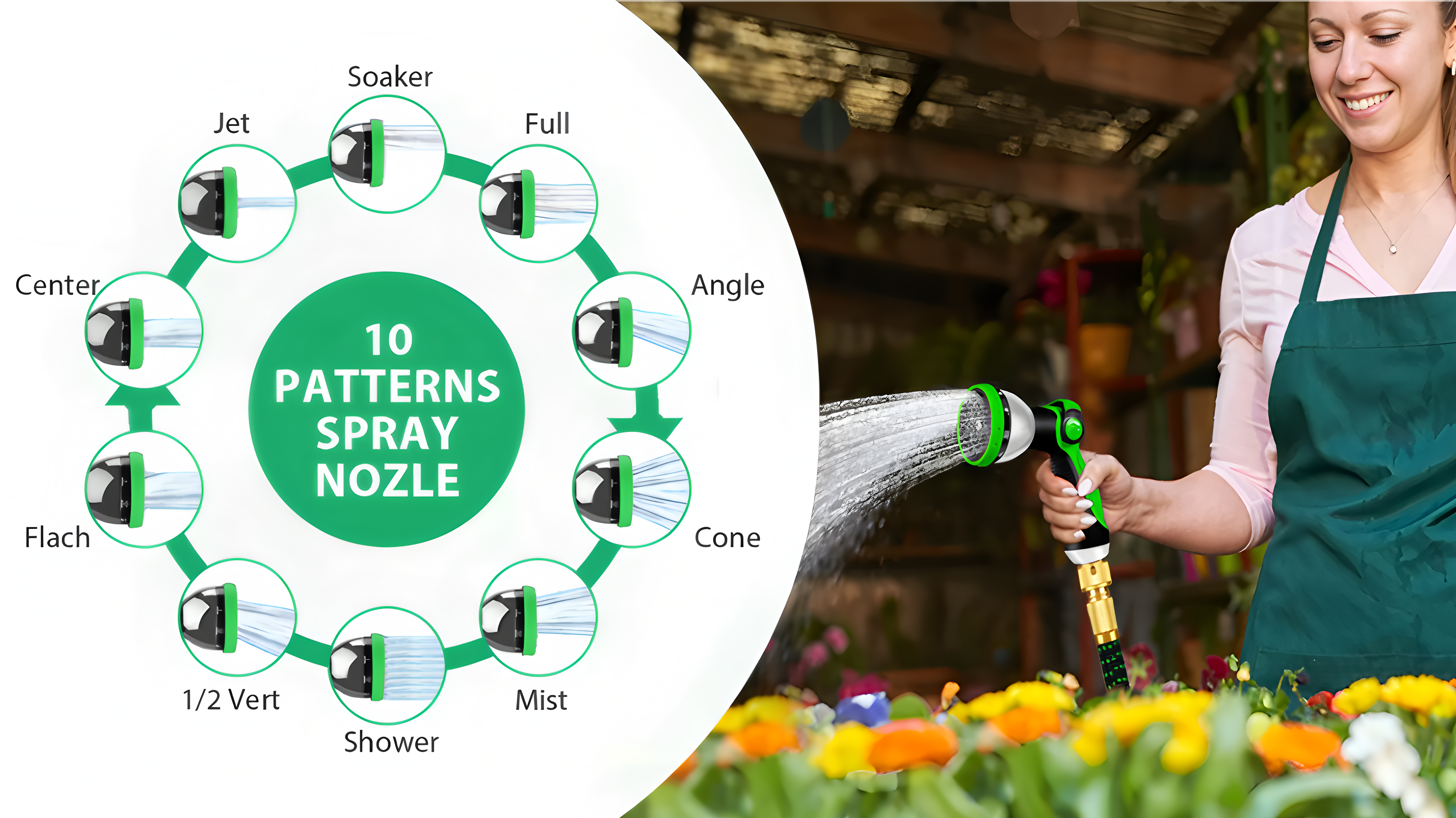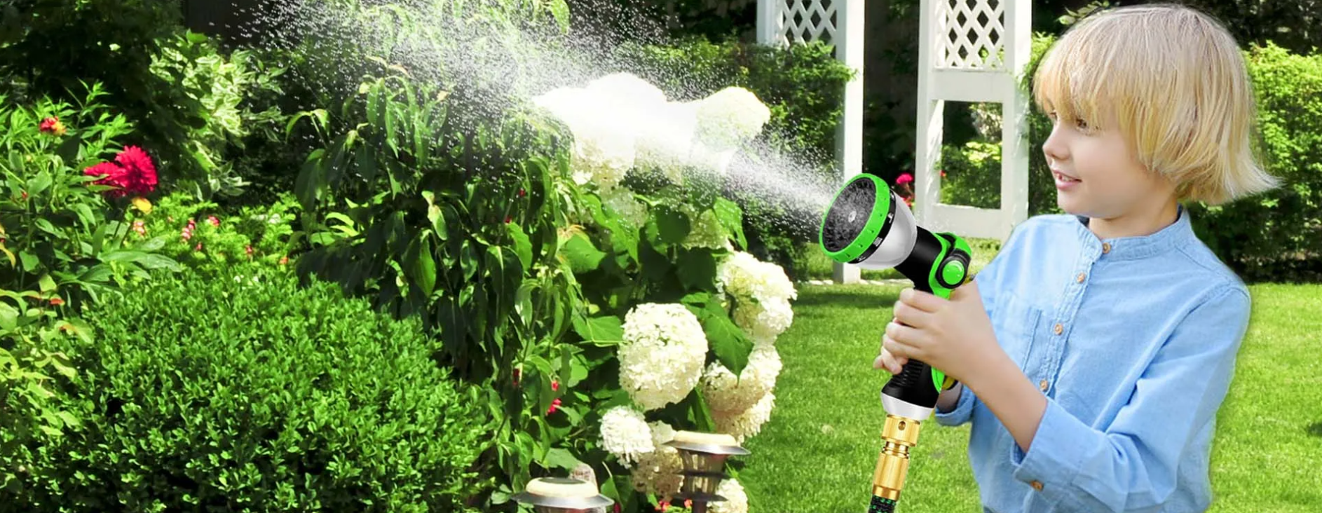 Comes with a multi-function spray gun, hose hanger, storage bag